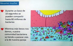 Ante la directora de la Facultad de Psicología (FP) de la UNAM, Magda Campillo Labrandero, abundó: durante un beso de 10 segundos se pueden distribuir hasta 80 millones de bacterias; mientras mayor número nos damos, nuestra comunidad microbiana tiende a parecerse más a la de nuestra pareja.