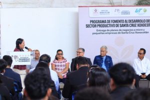 Santa Cruz Xoxocotlán, Oax. 08 de dic. de 2025.— En un impulso por fortalecer las alianzas estratégicas y la economía local, se llevó a cabo la clausura del Programa de Fomento al Desarrollo del Sector Productivo de Santa Cruz Xoxocotlán, donde micro y pequeñas empresas recibieron planes de negocio.