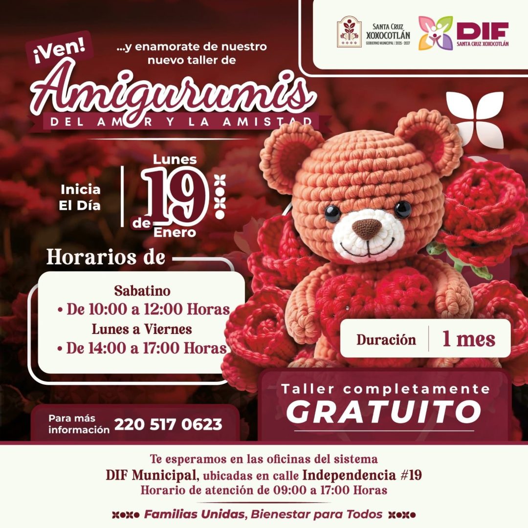 Santa Cruz Xoxocotlán, Oax., 17 de ene.– El DIF Municipal de Santa Cruz Xoxocotlán fomenta la creatividad y autoempleo a través de capacitaciones dirigidas a toda la población. Este lunes 19 de enero dará inicio un Taller de Amigurumis del Amor y la Amistad, donde las personas asistentes aprenderán a crear piezas tejidas a mano con motivo del amor y la amistad.
