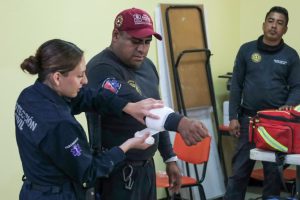 Durante las sesiones, personal especializado impartió conocimientos teóricos y prácticos sobre primeros auxilios básicos, manejo de extintores, prevención de incendios y protocolos para la evacuación de inmuebles en caso de sismo.