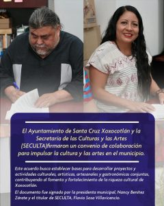 El Ayuntamiento de Santa Cruz Xoxocotlán y la Secretaría de las Culturas y las Artes (SECULTA)firmaron un convenio de colaboración para impulsar la cultura y las artes en el municipio.