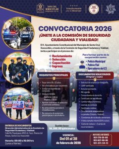 Santa Cruz Xoxocotlán, Oax., 15 de feb.– El Ayuntamiento de Santa Cruz Xoxocotlán lanzó la Convocatoria 2026 para pertenecer a la Comisión de Seguridad Ciudadana y Vialidad.