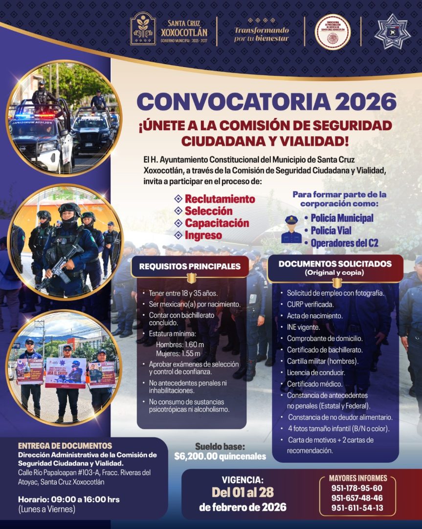 La convocatoria está dirigida a personas de entre 18 y 35 años, con bachillerato concluido y disposición para aprobar los exámenes de control y confianza, además de cumplir con los requisitos establecidos en la convocatoria oficial, la cual se encuentra disponible en las redes sociales del Gobierno Municipal de Santa Cruz Xoxocotlán.