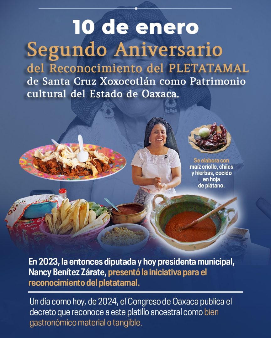 En respuesta a la iniciativa presentada por la entonces diputada y hoy presidenta municipal Nancy Benítez Zárate, el 10 de febrero de 2024, la Sexagésima Quinta Legislatura del Estado publicó el Decreto de reconocimiento del Pletatamal de Xoxocotlán como bien gastronómico material o tangible y sus técnicas de elaboración como Bien cultural Inmaterial e Intangible que forman parte del Patrimonio Cultural del Estado de Oaxaca.